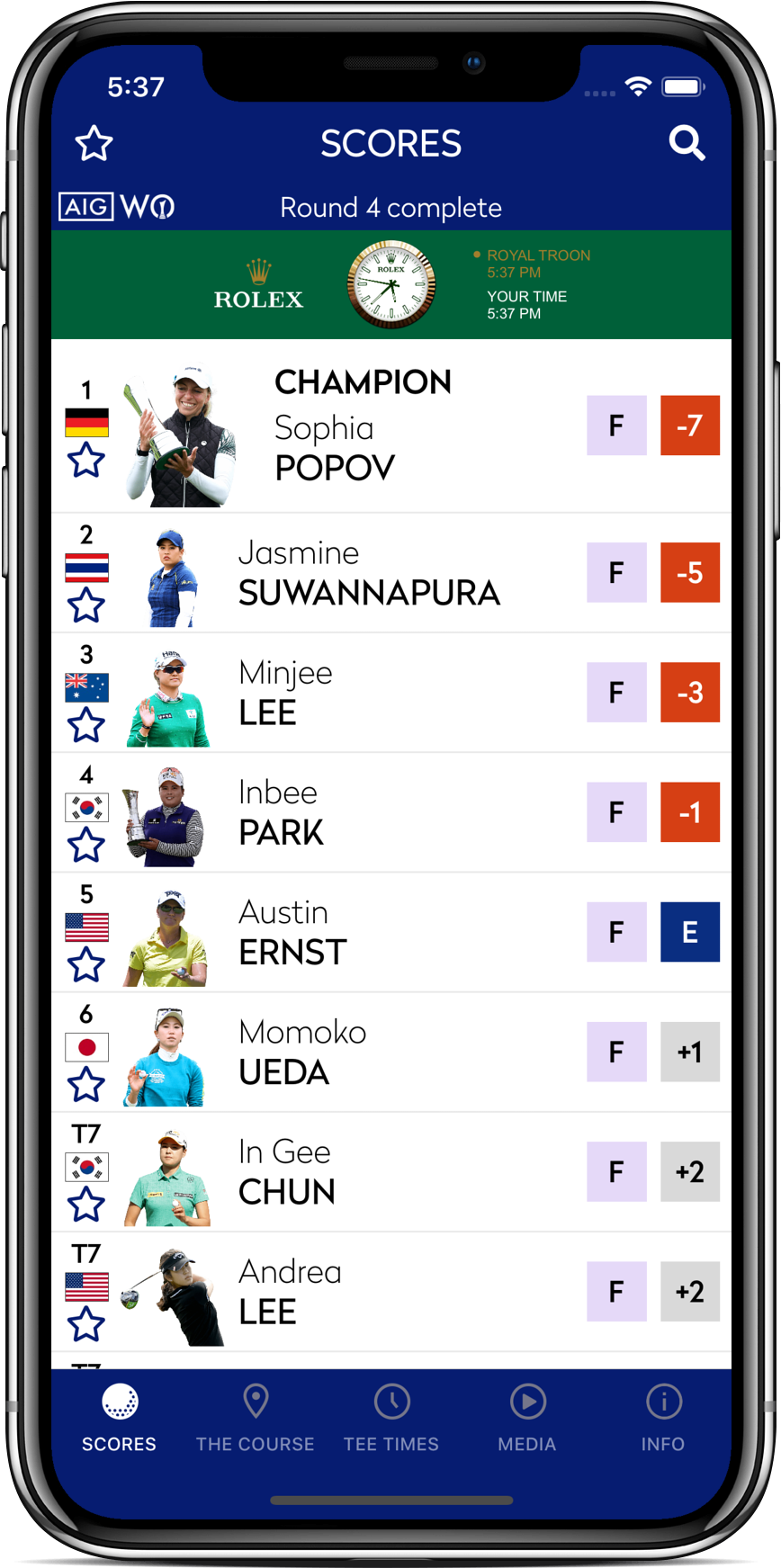 The AIG Women's Open was played without spectators due to the Covid-19 pandemic and was hailed a great success and a wonderful spectacle as the world's best golfers competed in some challenging conditions. Congratulations to Sophia Popov for winning with a final score of 7 under par. The app and framework performed really well and proved to be a great way of keeping up to date with the Championship using the live leaderboard, push notifications, live commentary and daily video highlights. It was extremely well received by fans and players alike and download numbers and reviews were excellent.